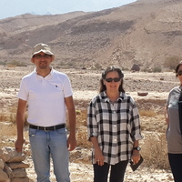 Jordan. Wadi Araba, Bir Madhkur, Barbara Porter, Nizar Al Adarbeh, Erin Addison, and Huda Kilani next to cairn on the ad-Dlayi path, ancient incense route