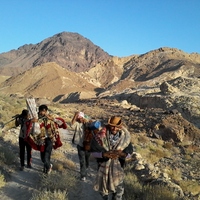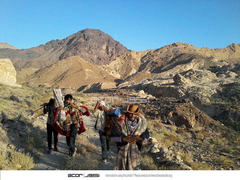 Jordan. Wadi Araba, Bir Madhkur, local workers carrying luggage and walking towards Petra to work on the preparation of the ad-Dlayi path, with 'Atud mountain in the background