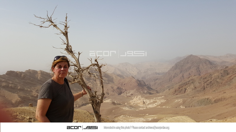Jordan. Wadi Araba, Bir Madhkur, Barbara Porter from ACOR next to juniper tree, ad-Dlayi path on the ancient incense route