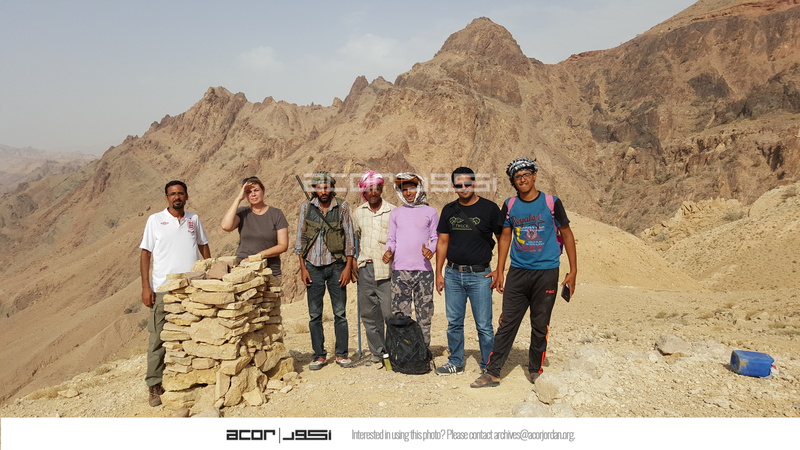 Jordan. Wadi Araba, Bir Madhkur, USAID SCHEP team members and local workers in front of cairn on the ad-Dlayi path