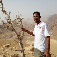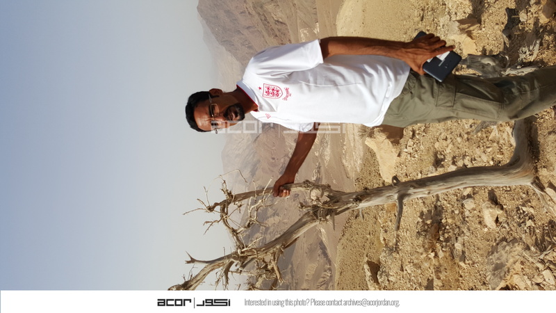 Jordan. Wadi Araba, Bir Madhkur, Site Steward Mohammad Saedeen next to juniper tree, ad-Dlayi path