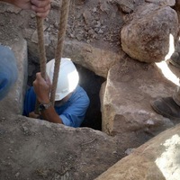 Jordan. Madaba, Madaba Archaeological Park West, MRAMP project Co-director Douglas Clark enters one of the site’s 6th-century Byzantine cisterns