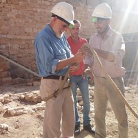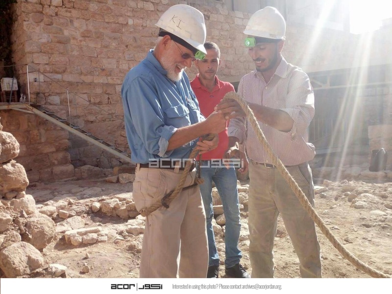 Jordan. Madaba, Madaba Archaeological Park West, members of the MRAMP team preparing project Co-director Douglas Clark for entrance into subterranean 6th-century Byzantine cistern, looking north