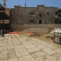 Jordan. Madaba, Madaba Archaeological Park West, 2nd-century paved Roman plaza with 6th-century Byzantine Martyrs Church to the left, modern building in the middle, and interpretive sign on the right, looking south