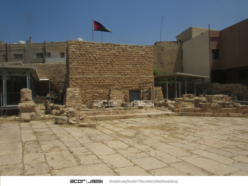Jordan. Madaba, Madaba Archaeological Park West, early 20th-century clinic building in center with two wings (covered, west and east) of the 6th-century Byzantine Burnt Palace, foregrounded by the 2nd-century paved Roman plaza and cardo