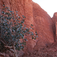 Jordan. Wadi Rum, Al Khazali mountain, cliff face, tree