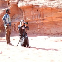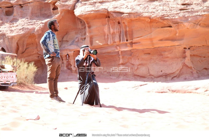 Jordan. Wadi Rum, Yusuf Ahmed of SCHEP and Mohammad Saedeen, SCHEP site steward at Bir Madhkur, take photographs