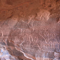 Jordan. Wadi Rum, Khazali canyon, rock art, Thamudic and Arabic inscriptions