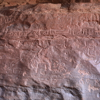 Jordan. Wadi Rum, Khazali canyon, rock art, Thamudic and Arabic inscriptions