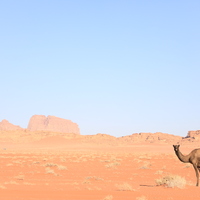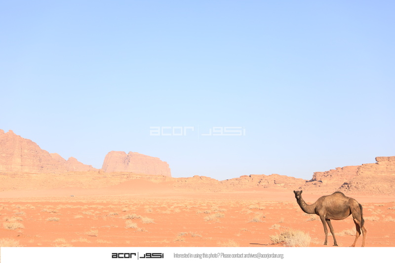 Jordan. Wadi Rum, general view of desert with mountains in background, camel