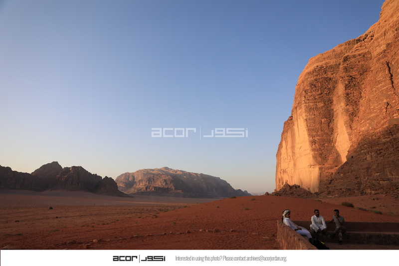 Jordan. Wadi Rum, group of Bedouin men at campsite