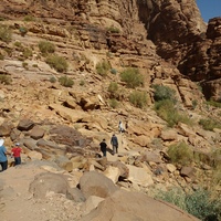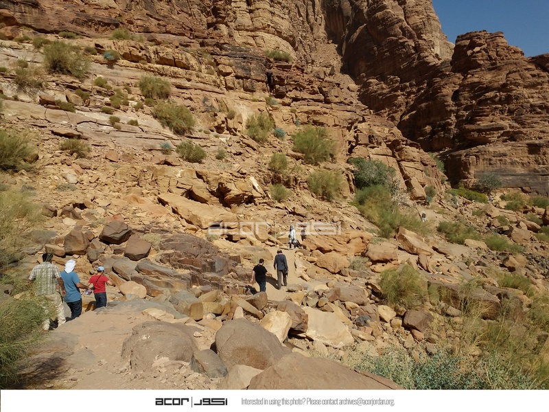 Jordan. Wadi Rum, Ain Shallaleh, SCHEP and USAID teams walking along pathway