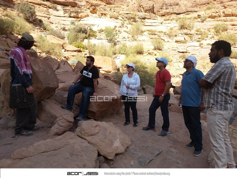Jordan. Wadi Rum, path to Ain Shallaleh, Glenn Corbett of ACOR provides context on rock art to SCHEP and USAID members