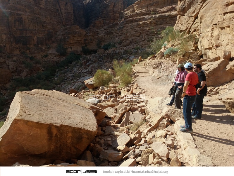 Jordan. Wadi Rum, Ain Shallaleh, SCHEP and USAID teams view rock art from pathway