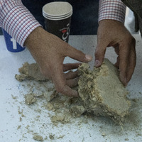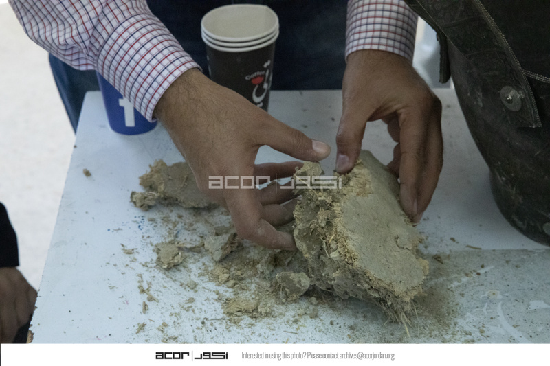 Jordan. At-Tafilah, archaeological site of Busayra, site implementation team conducting a site visit with USAID SCHEP team members, preparing the restoration mixture