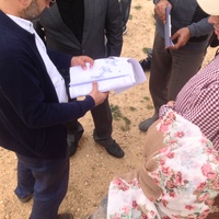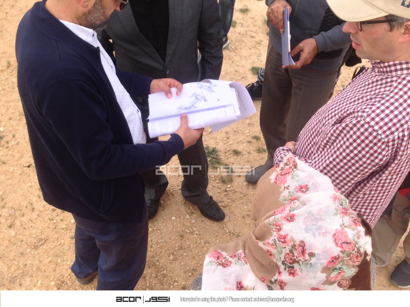 Jordan. At-Tafilah, archaeological site of Busayra, the administrative and political capital of the kingdom of Edom, Department of Antiquities representatives and USAID SCHEP team members look over site plans with surveyor Ahmed Al Marafi