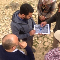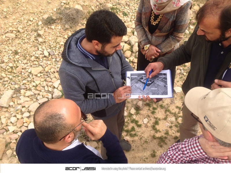 Jordan. At-Tafilah, archaeological site of Busayra, surveyor Ahmed Al Marafi discussing a map of the site with USAID SCHEP team members Jehad Haron and Hussein Khirfan and Jack Green of ACOR