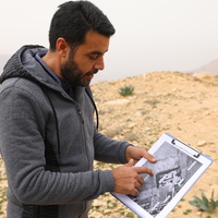 Jordan. At-Tafilah, archaeological site of Busayra, surveyor Ahmed Al Marafi discussing a map of the site