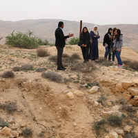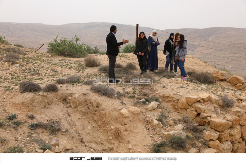 Jordan. At-Tafilah, archaeological site of Busayra, the administrative and political capital of the kingdom of Edom, site steward Ali Al Soide addresses SCHEP team members