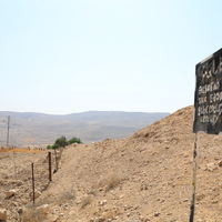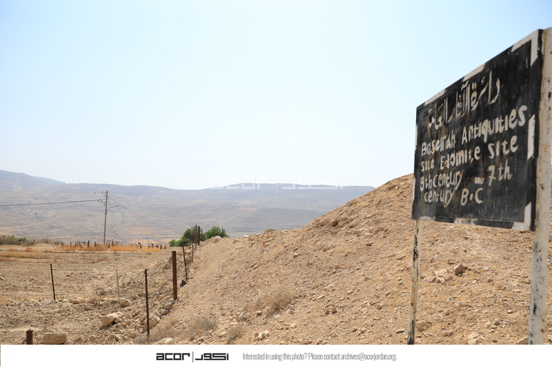 Jordan. At-Tafilah, archaeological site of Busayra, the administrative and political capital of the kingdom of Edom, old sign about site and fence built in the 1990s