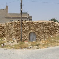 Jordan. At-Tafilah, Busayra, 19th century building with modern building in background