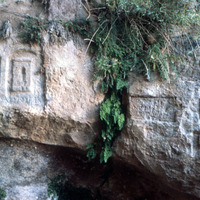 Jordan. Wadi Rum Sancturary, close up of carved Nabataean religious symbols - looking west