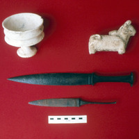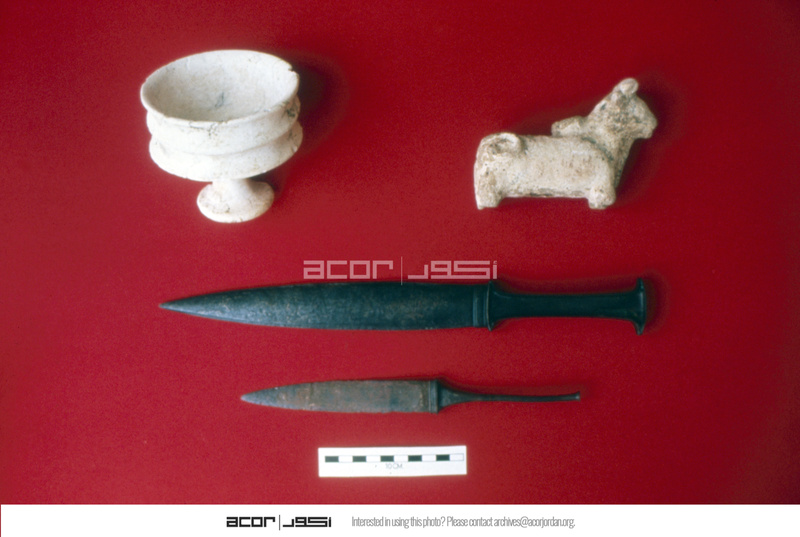Jordan. Qataret es-Samra, Late Bronze IB - IIA Objects (calcite tazza; ceramic animal figurine; bronze weapons) from Tomb at Qataret es-Samra cemetery