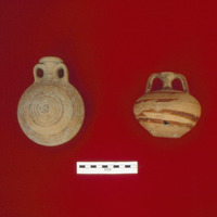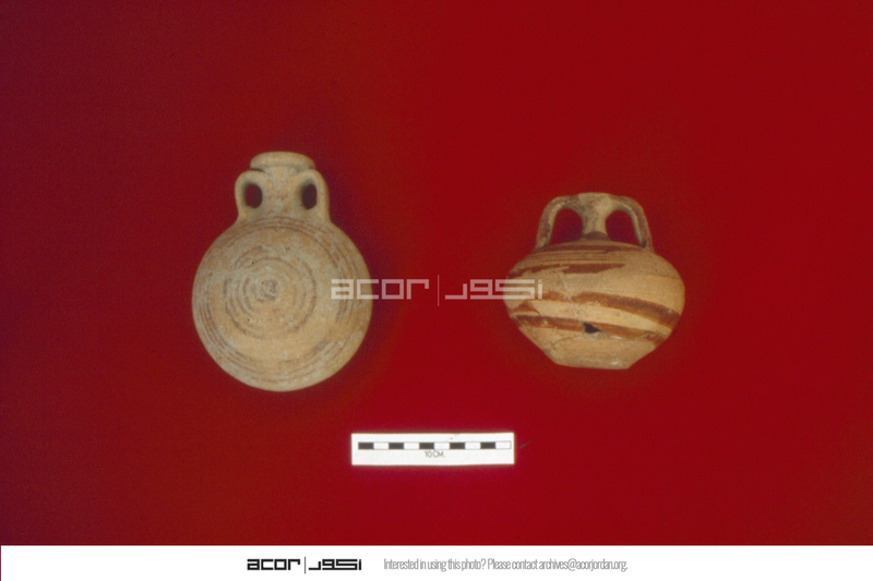 Jordan. Tall As-Sa'idiyeh, Late Bronze II painted flask (left) and Mycenaean "Stirrup Jar" (right)