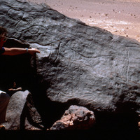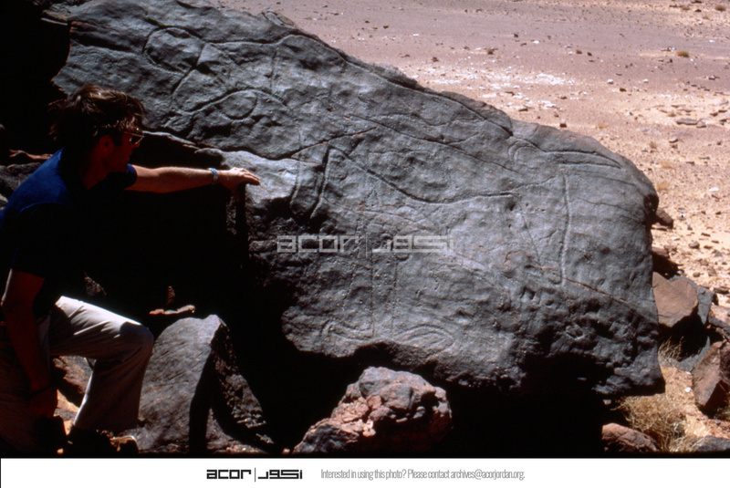 Saudi Arabia. Kilwah, Prehistoric (epi-Paleolithic/Early Neolithic?) rock drawing (large animal above; seated human below), with man pointing to it, looking East