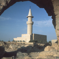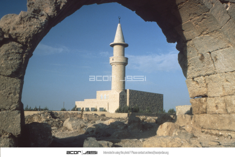 Jordan. Karak, Mashhad, looking Northeast, close up view of modern Mosque, from arch in ruins