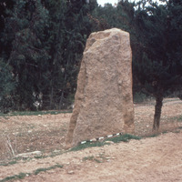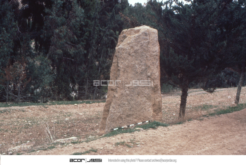 Jordan. Khirbat Iskandar, looking East, close up view of ca. 3m high standing stone (opposite Khirbet Iskander on South bank of Wadi Wala)