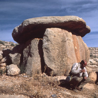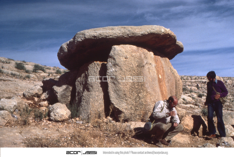Jordan. Khirbat Al Makhayyat, looking Northeast, close up view of Dolmen to Southwest of site (South of Wadi el-Mekhayyat), two men