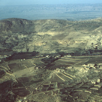 Jordan. Iraq al Amir, looking West, general view of site (Qasr to left; village to right), with Jordan Valley in Distance