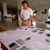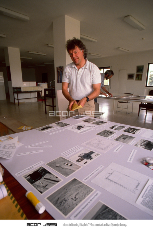 Jordan. ACOR Lower Library. John Oleson preparing exhibition materials for Irbid, International Conference on the History and Archaeology of Jordan (ICHAJ) 5th conference, 12-17 April 1992.