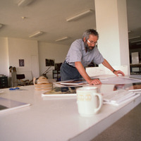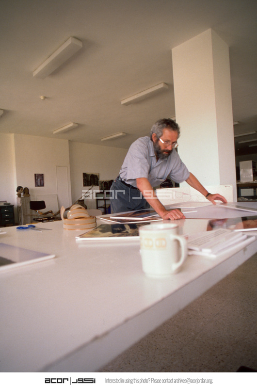 Jordan. ACOR Lower Library. Bert De Vries preparing exhibition materials for Irbid, International Conference on the History and Archaeology of Jordan (ICHAJ) 5th conference, 12-17 April 1992.