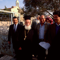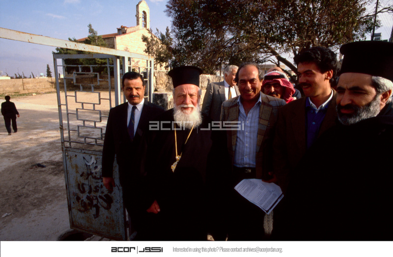 Jordan. Madaba, St. George's Greek Orthodox Church, Archibishop, Pierre Bikai and congregation outside the church
