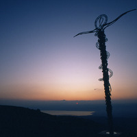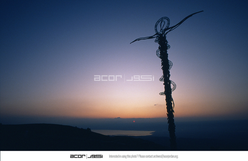 Jordan. Mount Nebo, modern cross, the 'Brazen Serpent Monument' and Dead Sea in background