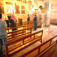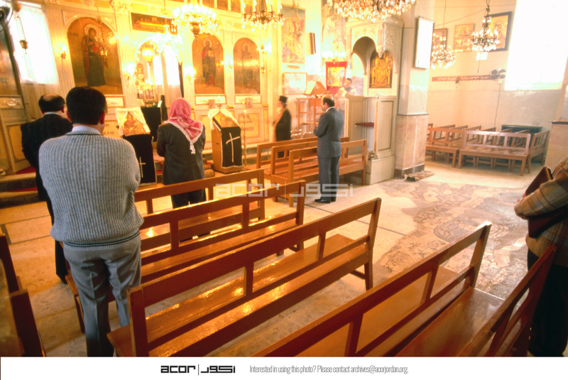 The Greek Orthodox Church of St. George, located to the northwest of the Roman street, was built in 1896 over the remains of a Byzantine church. The famous mosaic map is partially preserved as part of the church's floor. (Bikai. P. "Madaba: Cultural Heritage". 1996; p. 25) -- بنيت كنيسة القديس جريس للروم الأرثوذكس والواقعة الى الشمال الغربي من الشارع الروماني، في عام 1896 فوق بقايا الكنيسة البيزنطية. حيث توجد الخارطة الفسيفسائية المشهورة والمحفوظة نسبيا كجزء من أرضية الكنيسة. (بقاعي، بتريشيا. "مادبا البقايا التراثية. 1996؛ ص. 19)