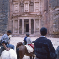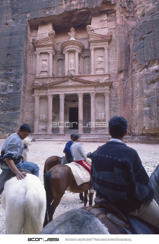 Jordan. Petra, Khaznet Far'oun (The Treasury) with horse riders