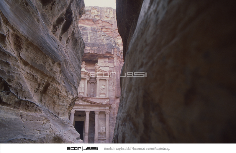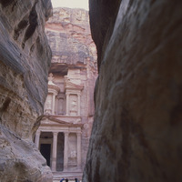 Jordan. Petra, View of Khaznet Far'oun (The Treasury) from the Siq