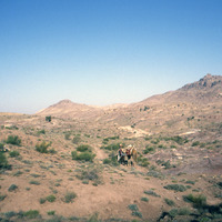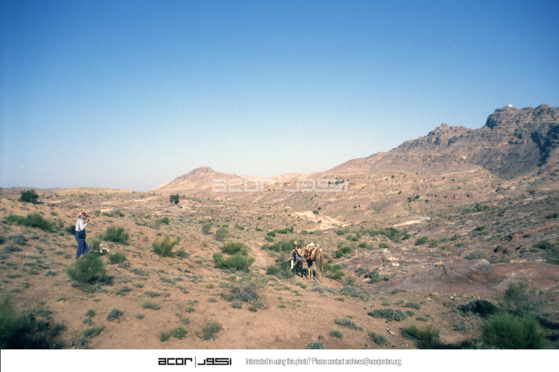 Jordan. Petra, Wadi Sabra with Jane Taylor, leaving Petra, loaded camel Jabal an-Nabi Harun